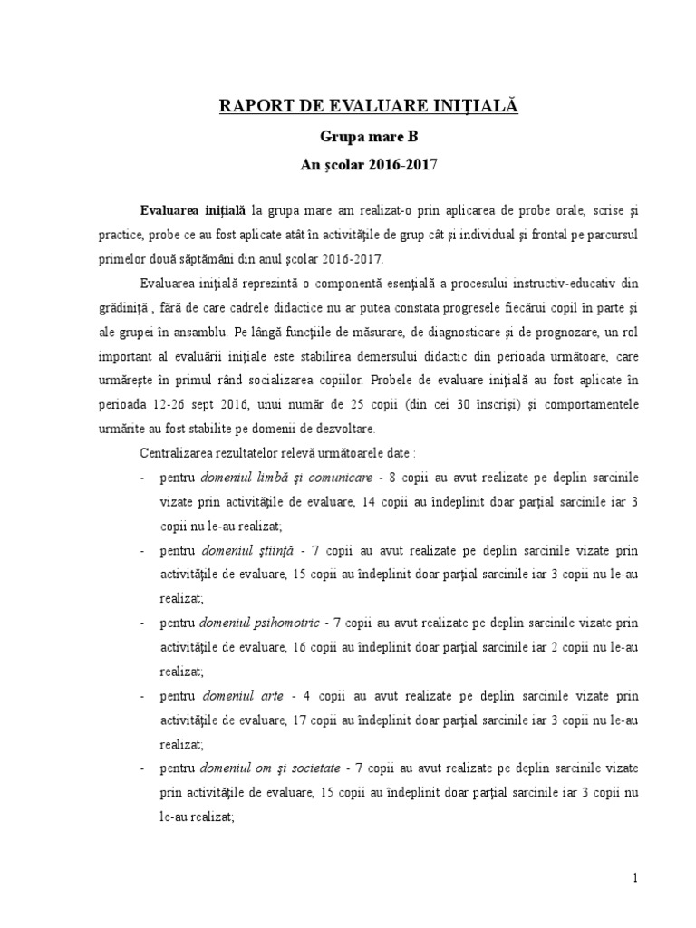 Evaluare initiala grupa mare 2016. Raport de evaluare initiala grupa mare. Evaluare inițială pe domenii experențiale. Este de nivel mediu. Evaluare initiala dlc grupa mare.