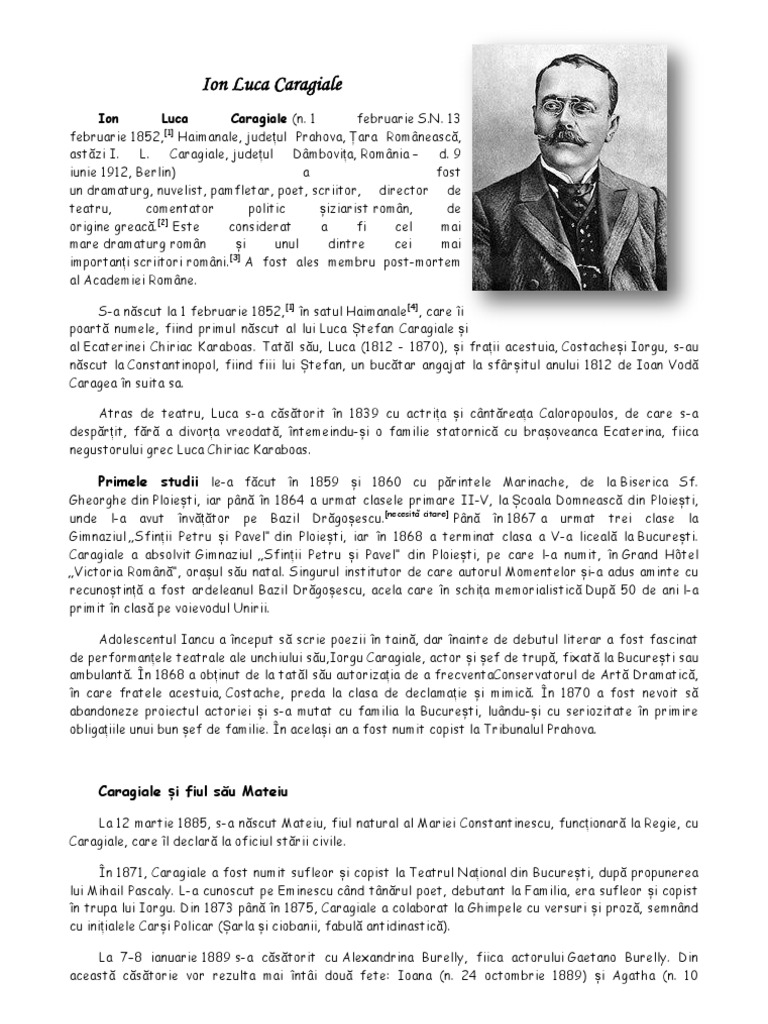 Fisa biografica ion luca caragiale. Ion luca caragiale was born into a family of greek descent whose members first arrived in wallachia soon after 1812 during the rule of prince ioan gheorghe caragea ştefan caragiali as his grandfather was known locally worked as a cook for the court in bucharest. 1 februarie 1852 haimanale județul prahova astăzi i. 1 din ploiesti avand ca institutori pe zaharia antinescu personaj bizar apoi pe basil dragosescu caruia ii va pastra o. 25 aprilie 2010 21 13.