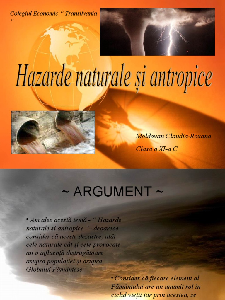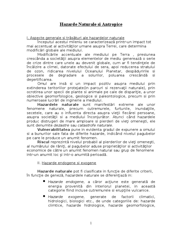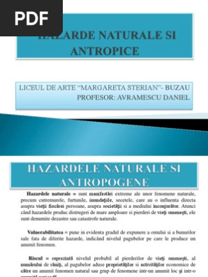 Hazarde naturale si antropice. Aspecte generale si trasaturi ale hazardelor naturale inceputul acestui mileniu se caracterizeaza printr un impact tot mai accentuat al activitatilor umane asupra terrei care determina modificari globale ale mediului. Hazarde naturale si antropice învăţământ liceal geografie lecţii clasa a 11 a. Frecventa locatia si intensitatea dezastrelor naturale. Hazardele sunt evenimente produse de fenomene cu putere distructiva care afecteaza atat mediul natural cat si activitatea omului fenomenele pot fi naturale se produc independent de activitatea oamenilor si antropice datorita activitatilor necorespunzatoare de utilizare a spatiului geografic.