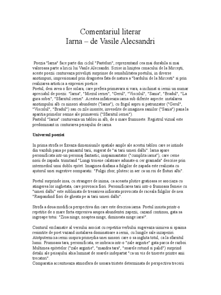 Totodată cu ajutorul acestui rezumat vei afla ce mijloace și procedee artistice folosește autorul pentru a da. Iarna de vasile alecsandri comentariu eseuri iarna de vasile alecsandri comentariu. Impresioneaza in mod deosebit prin plasticitate si forta de sugestie metafora oceanul de ninsoare. Iarna de vasile alecsandri comentariu vasile alecsandri a fost un poet dramaturg folclorist om politic el începe să publice pastelurile în anul 1868 a abordat specii literare din mai multe genuri creator al pastelurilor în limba română vasile alecsandri publică alături de alte poezii în care zugrăveşte peisaje ale patriei noastre surprinse în diferite anotimpuri.
