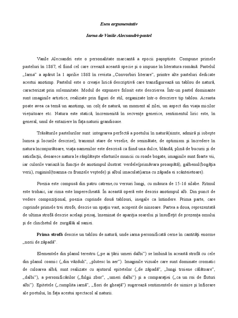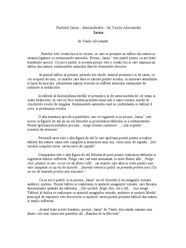 Citind acest eseu vei găsi toate argumentele de care ai nevoie pentru a putea demonstra că poezia iarna de vasile alecsandri este un pastel. Iarna de vasile alecsandri poezia pastel iarna de vasile alecsandri este un minunat pastel închinat anotimpului alb şi strălucitor fiind publicată în convorbiri literare în 1868. Soarele vântul şi gerul. Fulgii zbor plutesc în aer ca un roi de fluturi albi răspândind fiori de gheaţă pe ai ţării umeri dalbi.