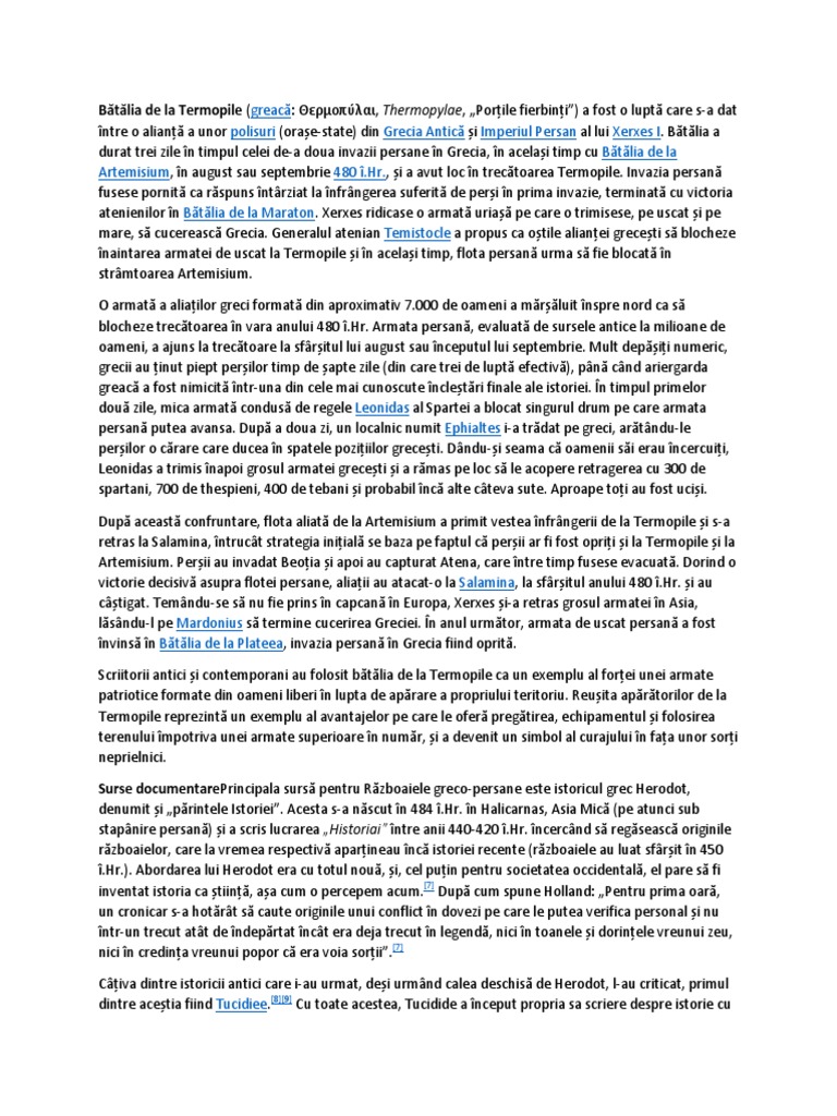 Bătălia de la termopile greacă θερμοπύλαι thermopylae porțile fierbinți a fost o luptă care s a dat între o alianță a unor polisuri orașe state din grecia antică condusă de regele leonidas al spartei și imperiul persan al lui xerxes i. Prea puţin comparativ cu marile civilizaţii ale antichităţii. Lupta de la termopile la un deceniu dupa ce imperiul persan a pornit prima invazie impotriva greciei cand armata persana a fost infranta la maraton urmasul lui darius i xerxes a pornit o a doua invazie asupra greciei generalul atenian temistocle a propus ca o armata a aliatilor greci sa blocheze stramtoarea de la termopile in fruntea acestei armate a fost ales leonidas regele spartan. Bătălia a durat trei zile în timpul celei de a doua invazii persane în grecia în același timp cu bătălia de la artemisium în august sau septembrie 480 î hr și a avut loc în trecătoarea termopile.