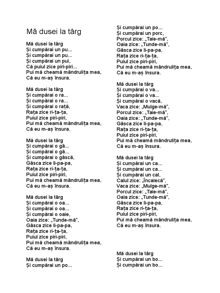 și cumpărai un pu. Mă dusei la târg și cumpărai o ra și cumpărai o ra și cumpărai o rață rața zice ri ța ța puiul zice piri piri pui mă cheamă mândrulița mea. şi cumpărai un pui că puiul zice piri piri. Piri piri pui ma chiama mandrulita draga mandrulita mea ma dusei la targ si cumparai o va.