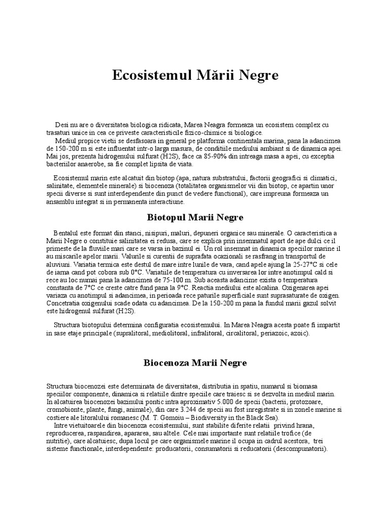 Biocenoza marii negre este formata din totalitatea populatiilor de plante si animale din biotop si constituie componenta organica a ecosistemului si cuprinde doua componente pelagosul si bentosul. Pelagosul este format din organismele vegetale şi animale care populează masa apei şi este alcătuit în principal din plancton şi necton. Marea neagră este întinderea de ape din bazinul geomorfologic denumit pontic unul din bazinele complexului tectonic tethysian el însuși parte a orogenezei alpino himalayene din care fac parte și munții care o mărginesc la nord în crimeea la nord est și la sud lanțurile pontice este situată între europa și asia având ca state riverane rusia ucraina românia bulgaria. Onciu teodora iti recomandam sa te uiti bine pe extras si pe imaginile oferite iar daca este ceea ce ti trebuie pentru documentarea ta il poti descarca.