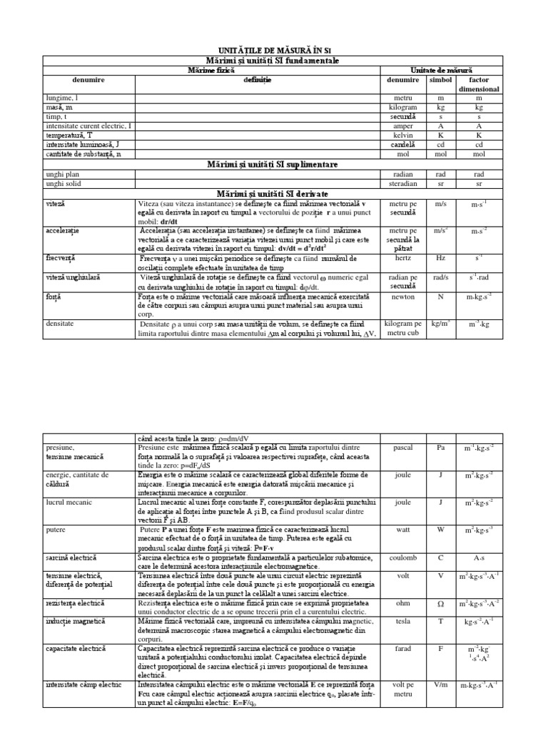 Marimi fizice si unitati de masura tabel. Formule mrimi fizice i uniti de msura simbolul marimii fizice f denumirea mrimii fizice forta formula f ma legea. Sistemul international de unitati de masura si. Marimile derivate si respectiv unitatile lor de masura se deduc pe baza legilor prin care se definesc aceste marimi. Se defineste forta ca acel element care intervenind asupra unui corp ii imprima acestuia o anumita acceleratie.