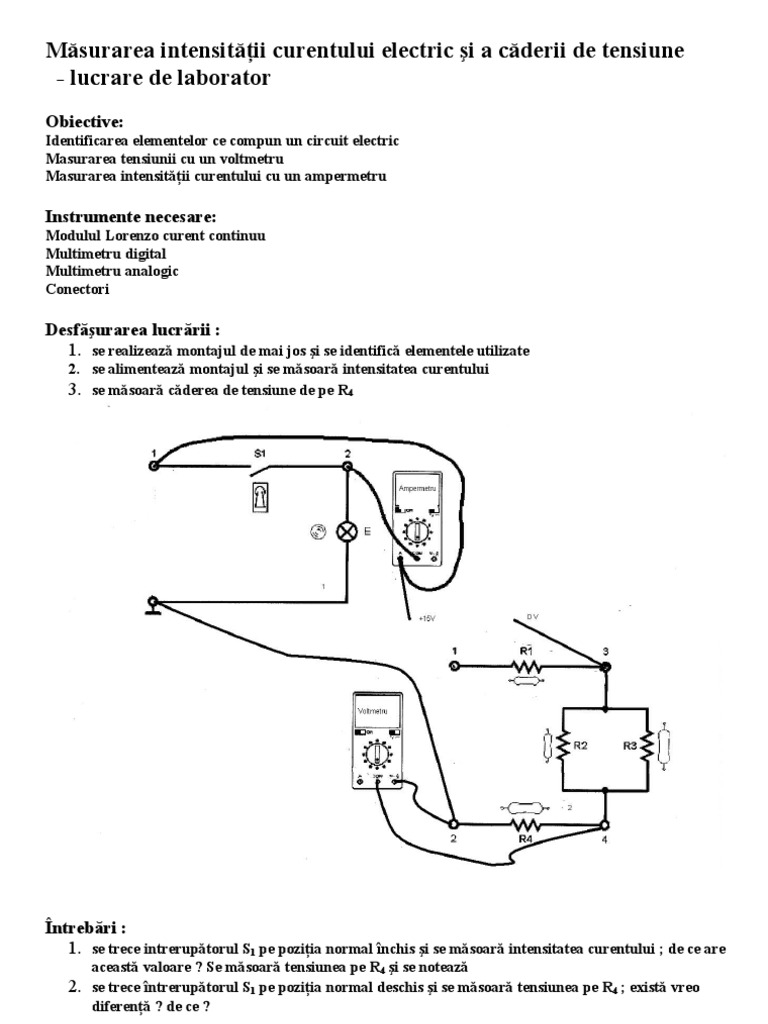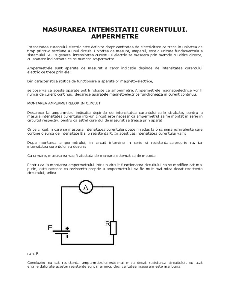 Există o foarte mare diversitate a sistemelor de măsurare a celor doua mărimi de baza motiv pentru care alegerii acestora în vederea efectuării unei măsurări trebuie să i se acorde o. Se consideră un circuit electric în care rezistenţa r este alimentată de la o sursă de curent continuu. Ampermetre intensitatea curentului electric este definita drept cantitatea de electricitate ce trece in unitatea de timp printr o sectiune a unui circuit. Masurarea curentului si tensiunii electrice.