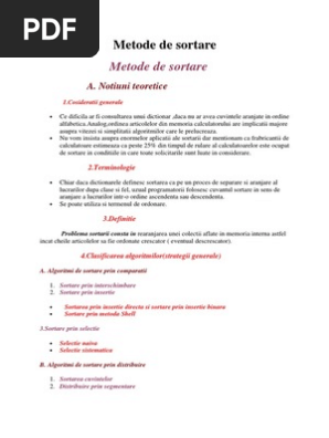 Metode de sortare c. Prin metoda de sortare prin metoda buleleor se parcurge vectorul şi se compară fiecare element cu succesorul său. Algoritmul de sortare prin interschimbare foloseste o 1 spatiu extra pentru cateva variabile temporare. Metode avansate de sortare 2 1 quicksort în practicã algoritmul de sortare cel mai rapid este quicksort numitã sortare rapidã care foloseste partitionarea ca idee de bazã. Metodele directe se bazeaza pe algoritmi de dificultate redusa usor de gasit si de inteles.