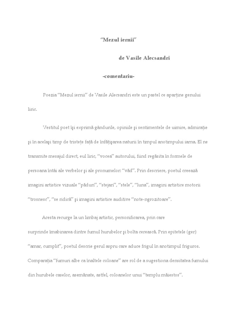 în păduri trăsnesc stejarii. Mezul iernii de vasile alecsandri ipoteză publicate în 1868 1869 în revista convorbiri literare pastelurile lui alecsandri reprezintă o operă de maturitate. Stelele par îngheţate cerul pare oţelit iar zăpada cristalină pe câmpii strălucitoare. E un ger amar cumplit.