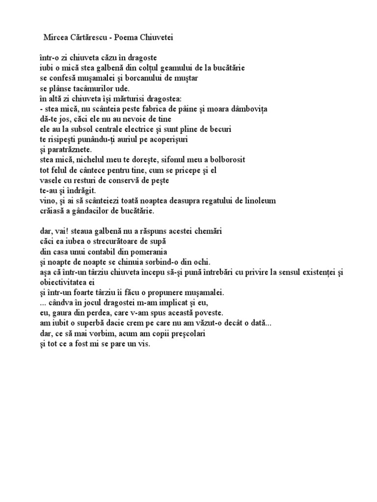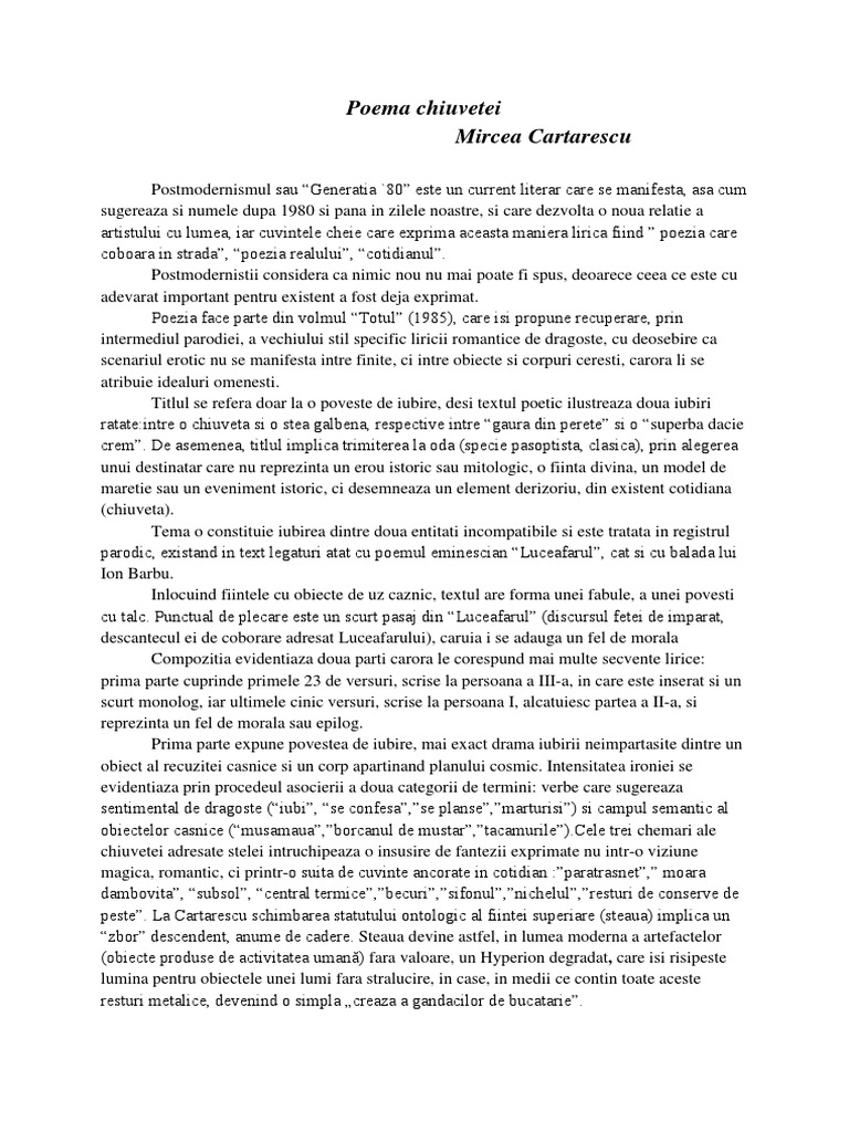 Cărtărescu 1956 poet prozator şi publicist este un reprezenzentant de seamă al generaţiei 80 şi al postmodernismului românesc. Romanian poetry mircea cartarescu poezii românesti. Jurnalista mirela voicu a făcut cunoscut acest caz. Poema chiuvetei scrisă de mircea cărtărescu este o poezie postmodernistă care strong parodiază subtil povestea de dragoste dintre luceafăr și cătălina.