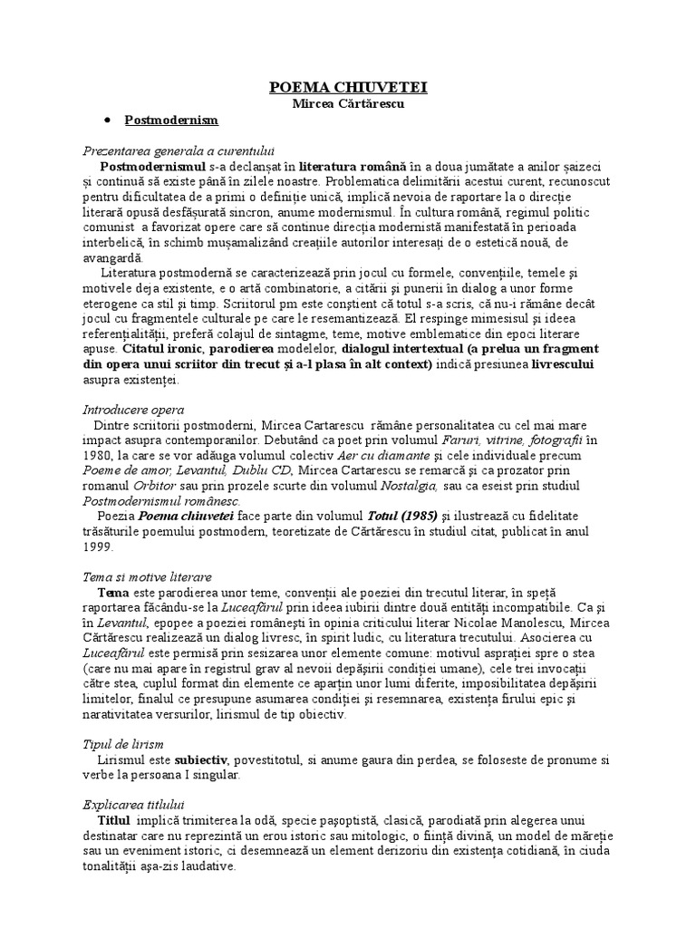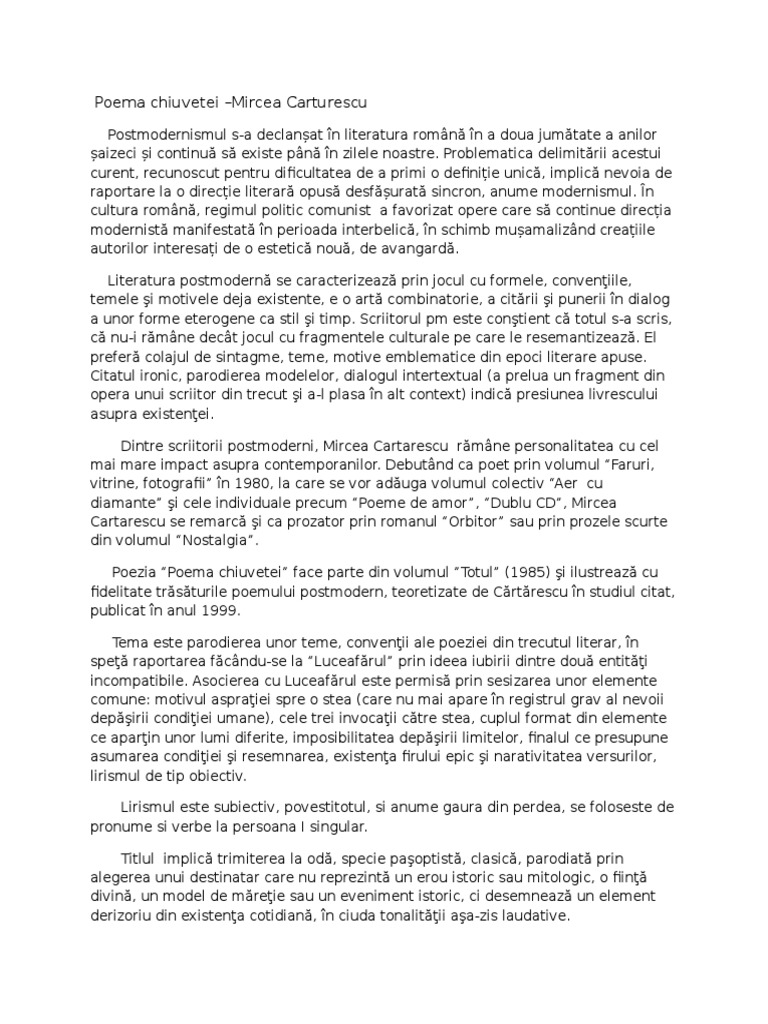 Aceasta poartă însemne ale postmodernismului printre care se numără temele filozofice abordate într o manieră parodică și limbajul liric adoptat de autor. De mircea cărtărescu m. Poezia poema chiuvetei este publicată în anul 1982 perioadă de debut al curentului literar postmodernist. Poema chiuvetei a apărul prima dată în 1982 în volumul colectiv aer cu diamante m.