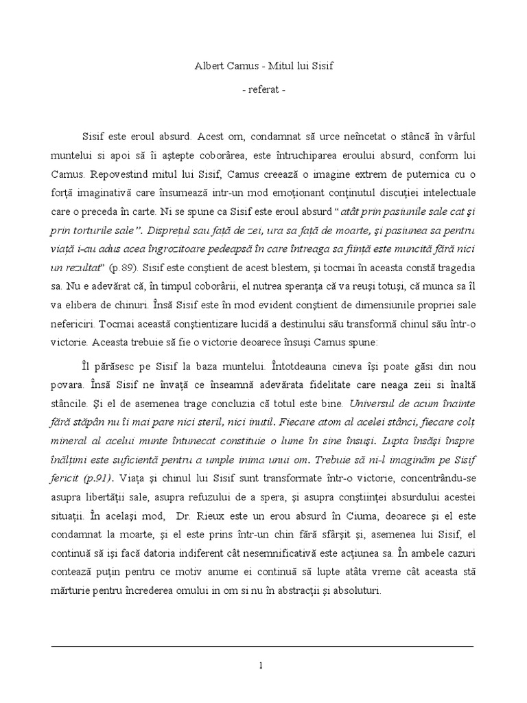 A 43 561 mitologia greaca si zeii greciei antice vechii greci spuneau povesti grozave despre zeii lor. Versiunea pe care o preferă albert camus în eseul său mitul lui sisif povestește despre sisif care apropriindu se de moarte testează devotamentul soției sale. Subliniez ca este ciudata alegerea acestui personaj de catre camus. In mitul lui sisif gasim bazele filosofice ale strainului doctorului etc.