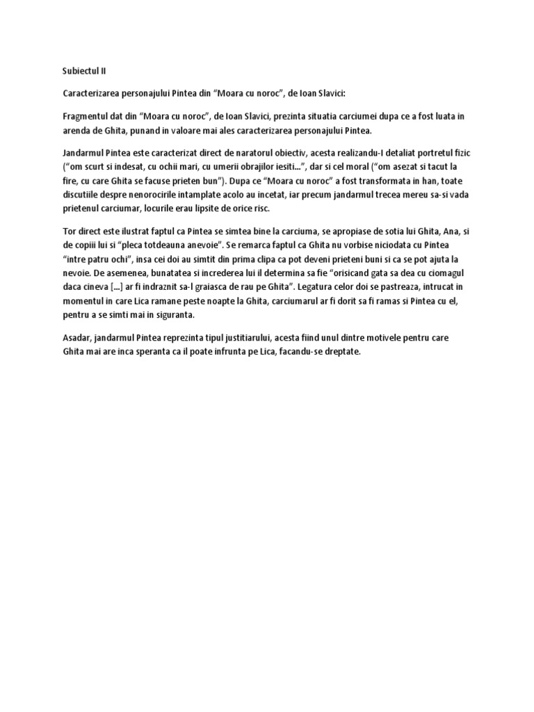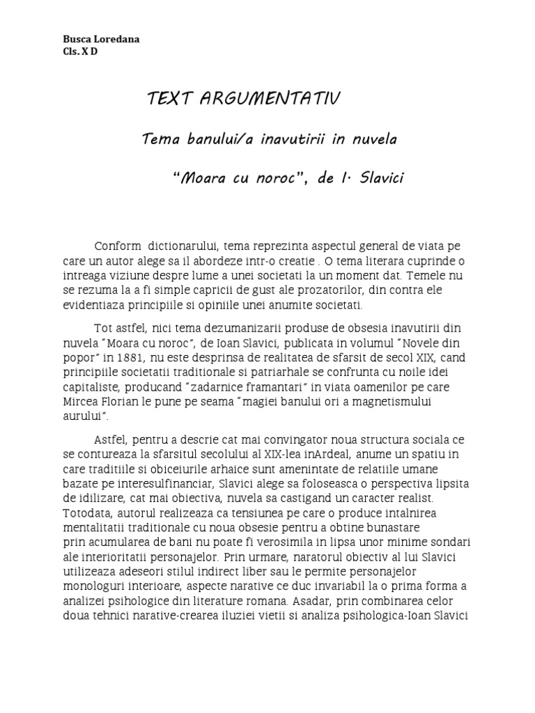 Moara cu noroc eseu argumentativ. Personajele relativ puţine pun în evidenţă evoluţia personajului principal. De asemenea moara cu noroc este o nuvelă realistă prin tema familie şi a dorinţei de prosperitate obiectivitatea perspectivei narative includerea de personaje tipice pentru o categorie socială de exmplu ghiţă reprezintă tipul cârciumarului dornic de îmbogăţire pintea este jandarmul lică este sămădăul dar şi tâlharul prezentarea veridică a societăţii ardeleneşti. Personajul principal ghita din opera literara moara cu noroc participa la schimbarea statutului social si moral. Moara cu noroc eseu argumentativ.