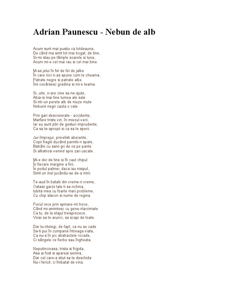 Daca ti am fost de folos cu aceasta piesa sau oricare alta ne poti bucura cu o distribuire mai departe sa afle cat mai multa lume de noi si sa se bucure de serviciul pe. Daily we added a hundreds of new songs with chords and tabs just for you. Acum sunt mai pustiu ca totdeauna de când mă simt tot mai bogat de tine și mi stau pe tâmple soarele și luna acum mi e cel mai rău și cel mai bine. View credits reviews tracks and shop for the 2006 cdr release of nebun de alb on discogs.