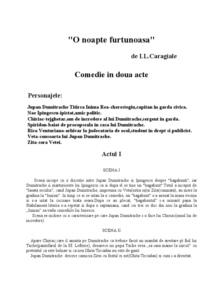 O noapte furtunoasa rezumat. Personajul principal al comediei o noapte furtunoasa de i l caragiale este jupan dumitrache titirca poreclit inima rea. Mobile de lemn și paie. Ușă în fund dând în sala de intrare. Giugaru nae ipingescu.