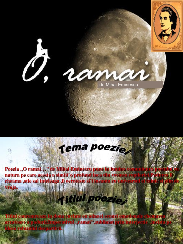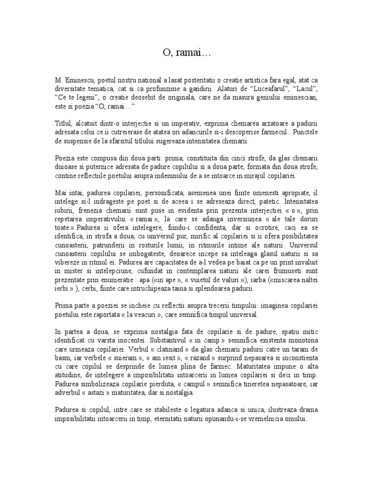 O ramai de mihai eminescu comentariu. Dupa cum iti amintesti poezia aceasta are trei strofe iar dintre acestea doar in prima este evocata imaginea mamei celelalte fiind adresate iubitei pe care poetul o indeamna in strofa a doua sa nu planga la crestetul sau de va muri inainte si pe care si ar dori o alaturi in incaperea aceluiasi sicriu de va fi sa moara impreun asocierea celor doua fiinte atat de importante pentru. şi prin vuietul de valuri prin mişcarea naltei ierbi. Limba şi literatura română proiecte educaţionale o ramai de mihai eminescu. Ale tale doruri toate numai eu ştiu să le ascult.