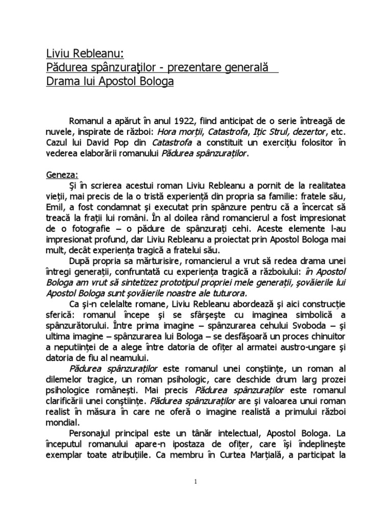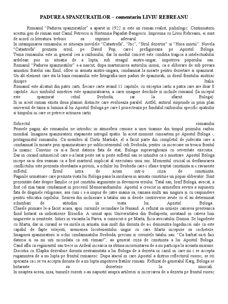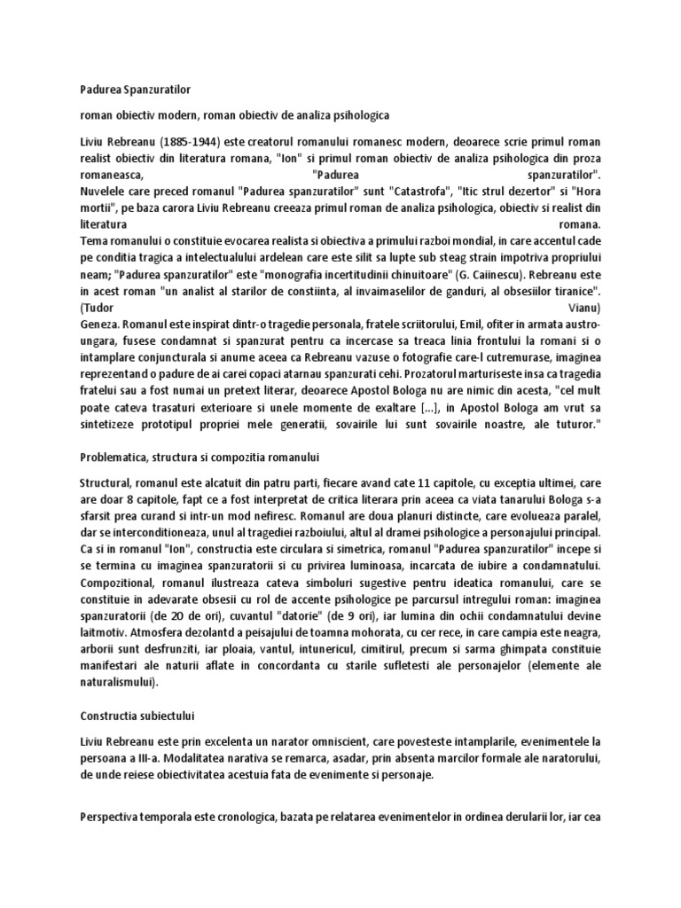 Padurea spanzuratilor roman de liviu rebreanu. De asemenea vei avea un model de rezolvare a cerinței de la examenul de bacalaureat din data de 27 08 2012 sesiunea august septembrie când elevilor de la profilul uman li s a cerut să scrie un eseu în care să prezinte tema și viziunea despre lume într un roman studiat. în elaborarea eseului vei avea în vedere următoarele repere evidenţierea. Varianta 43 tema si viziunea despre lume intr un roman psihologic interbelic padurea spanzuratilor de liviu rebreanu.