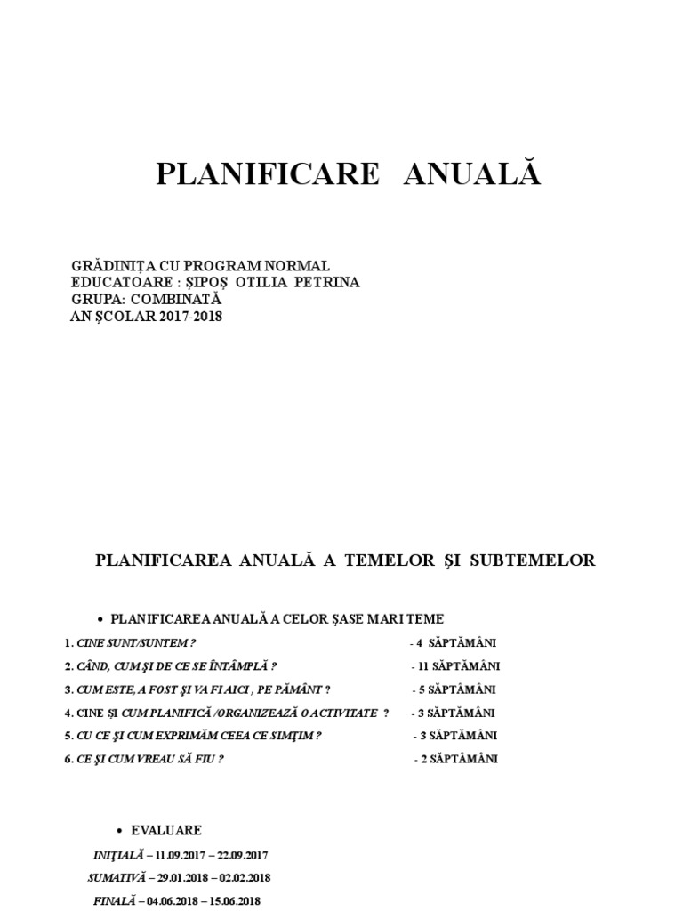 Planificarea temelor subtemelor proiectelor tematice corespunzatoare anului scolar 2017 2018 pentru invatamantul prescolar grupa combinata. De asemenea veti regasi planificarile anuale pentru seria licurici. 25 septembrie 2017 09 23. Planificare anuala grupa mijlocie.