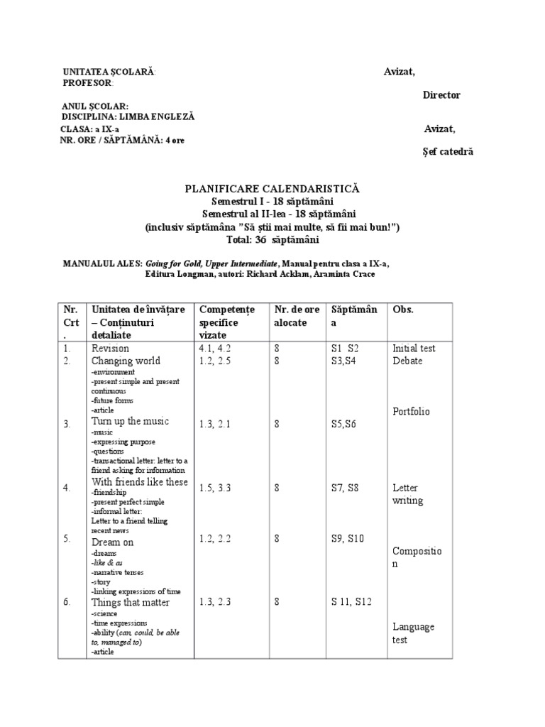 Planificare comunicare in limba engleza cls i descarca in format word. 0 stele 0 review uri. Oferirea unei reacţii adecvate la o întrebare instrucţiune scurtă şi simplă rostită clar şi foarte rar adresată cu atenţie de către interlocutor 1 2. Planificare calendaristica limba engleza pentru clasa 1 a anul scolar 2018 19.