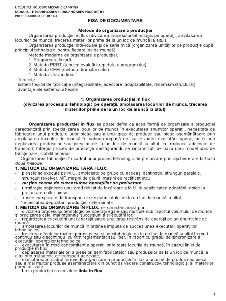 Planificarea şi organizarea producţiei. Organizarea producţiei în flux se poate defini ca acea formă de organizare a producţiei caracterizată prin specializarea locurilor de muncă în executarea anumitor operaţii necesitate de fabricarea unui produs a unor piese sau a unui grup de produse sau piese asemănătoare prin amplasarea locurilor de muncă în ordinea impusă de. Conceptul de proces de producție obţinerea bunurilor materiale ca rezultat al desfăşurării procesului de producţie industrial constituie activitatea principală a întreprinderilor industriale. Catedra tehnica virtuala de pe portalul eprofu ro.