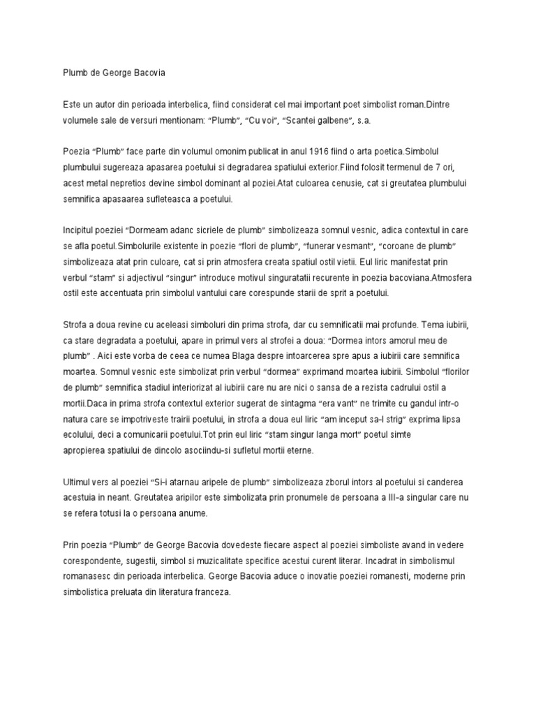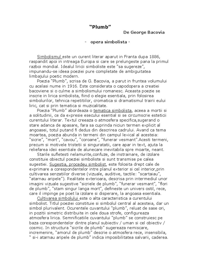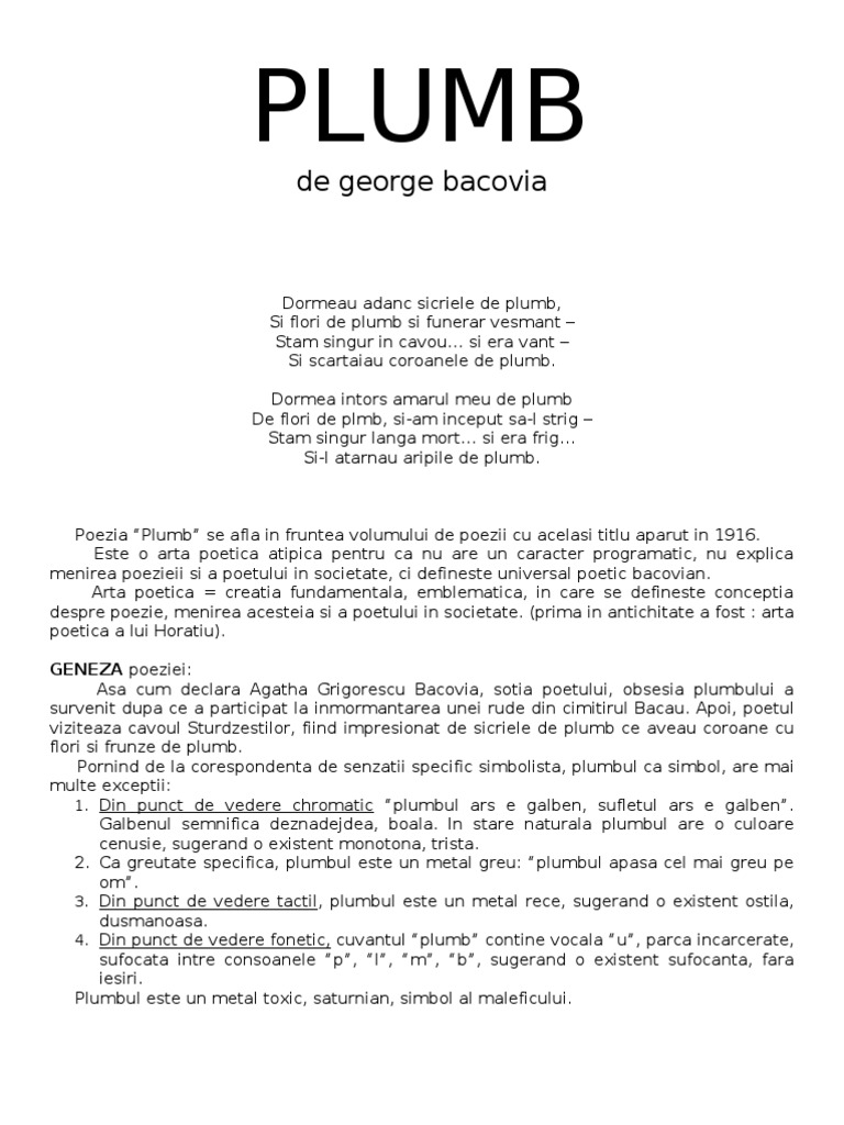 Aceasta arată că poezia era considerată de autorul ei ca reprezentativă pentru creația lui. Dormea întors amorul meu de plumb pe flori de plumb și am început să l strig stam singur lângă mort și era frig și i atârnau aripile de plumb. Plumb de george bacovia poezia plumb deschide volumul de debut al lui bacovia din 1916 căruia îi dă și titlul.