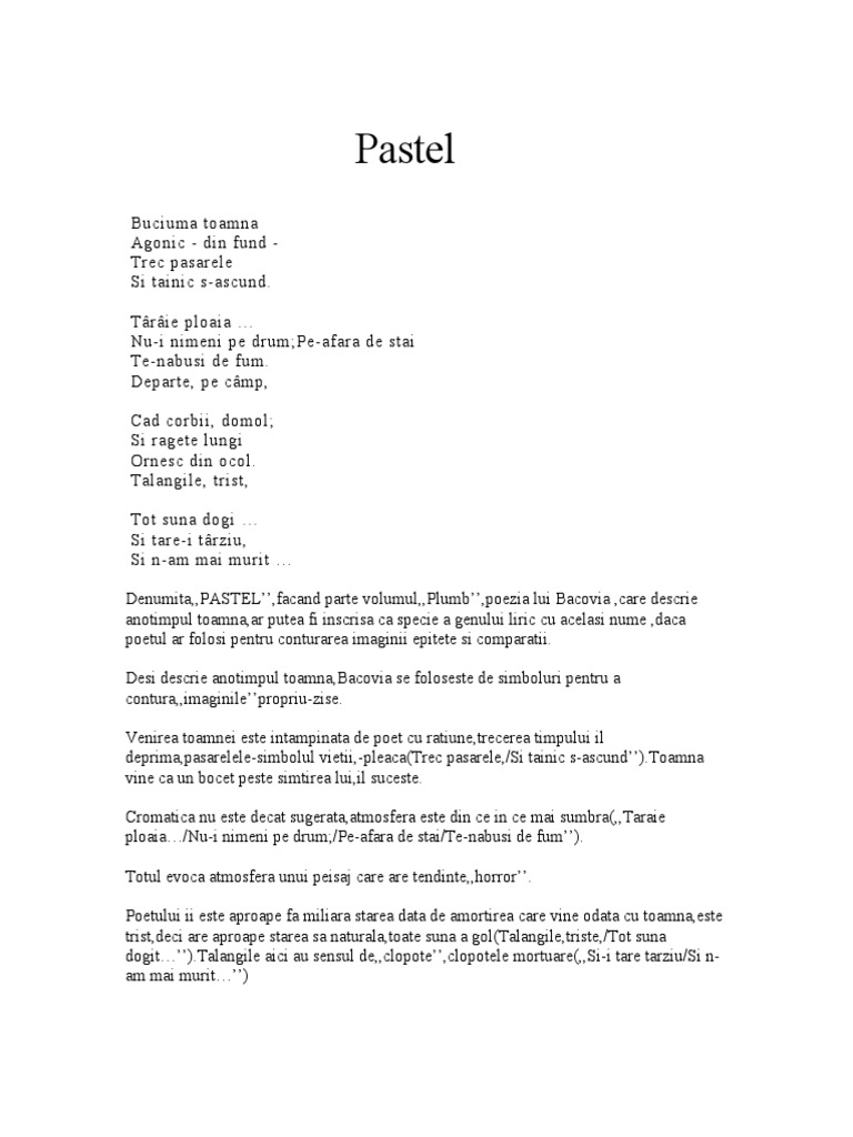 Discursul poetic este conceput sub forma unui monolog tragic în care poetul exprimă o stare sufletească de disperare și lipsă a oricărei speranțe. De george bacovia poezia plumb a apărut în fruntea volumului de debut cu acelaşi nume din 1916 care a trecut aproape neobservat în epocă mai ales pentru că românia se pregătea să intre în primul război mondial. Opera volume de poezie. Plumb 1916 scântei galbene 1926 cu voi etc.