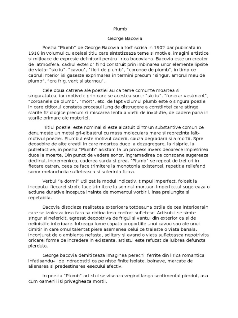 Poezia plumb de george bacovia 1881 1957 deschide volumul de debut cu acelaşi nume apărut în 1916 care a trecut aproape neobservat în epocă mai întâi pentru că românia se pregătea să intre în primul război mondial apoi deoarece majoritatea poeziilor din acest volum fuseseră deja publicate în revistele vremii. Plumbul arata pasarea sufleteasca si golul interior iar acestea fac parte din elementele simboliste ale operei. Volumul de poezie plumb 1916. George bacovia și simbolismul 1881 1957 simbolismul în românia s a deschis cu macedonski dar și cu poezia la staua a lui mihai eminescu.