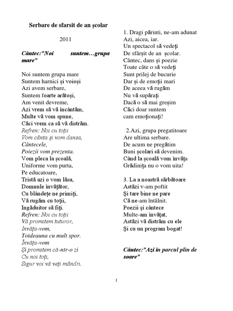 Azi e prima zi de școală autor. Sfarsit de clasa i serbare. La clasa i la final de an școlar învățarea citit scrisului este sărbătorită de exemplu prin momente artistice serbări cu și despre literele alfabetului pentru o astfel de serbare a abecedarului sau a literelor în documentul arhivat de mai jos găsiți floricele cu literele alfabetului dar și cu. 0 au spus mulţumesc.