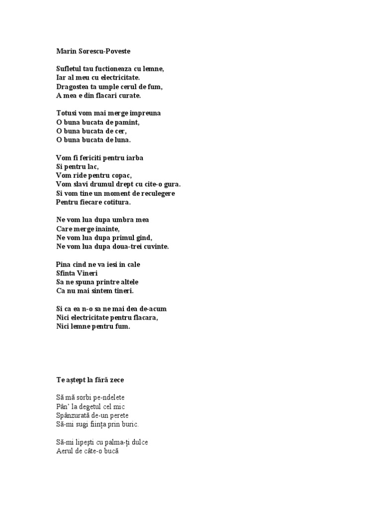 Până la moartea sa în 1996. Sufletul tău funcţionează cu lemne iar al meu cu electricitate dragostea ta umple cerul de fum a mea e din flăcări curate. Poveste este o poezie scrisă de marin sorescu și inclusă în volumul moartea ceasului publicat în anul 1966. Spun doua trei cuvinte şi cat ţi i castelul lor de mare da buzna în mar cu coarnele turnurilor înainte.