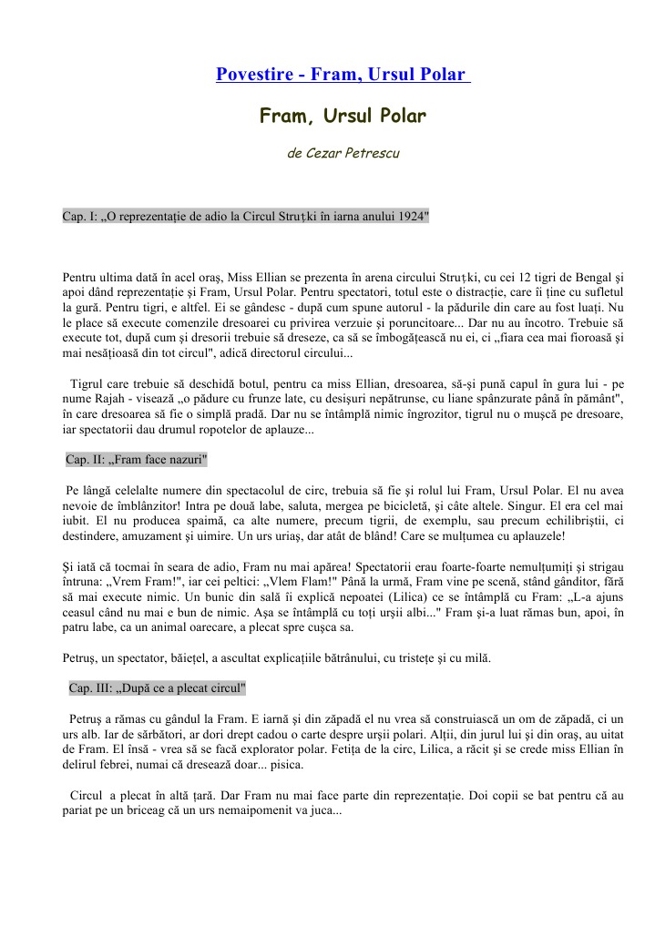 Fram ursul polar intra fără îmblânzitor și își făcea numerele fără ghidare. Fram ursul polar de cezar petrescu repovestire cartea cuprinde 16 capitole şi o voi repovesti urmărind împărţirea propusă de autor. Urmeaza multe aventuri mai fericite sau triste prin care trece acest urs. Povestea este scrisa de camil petrescu publicata in anul 1931.