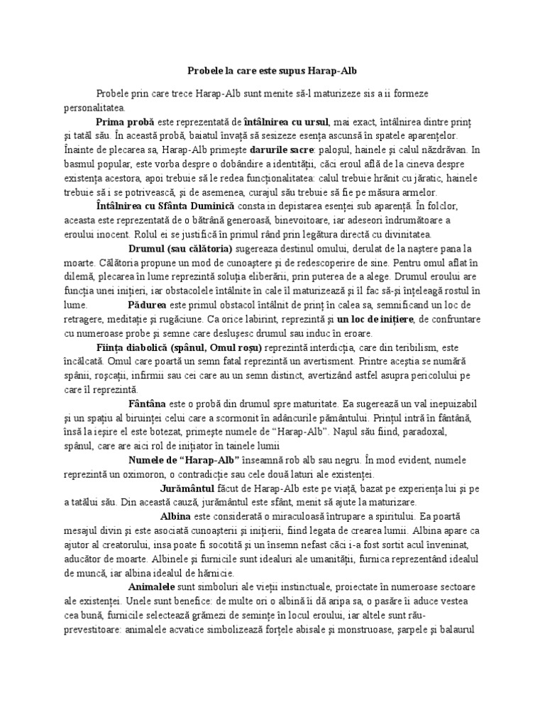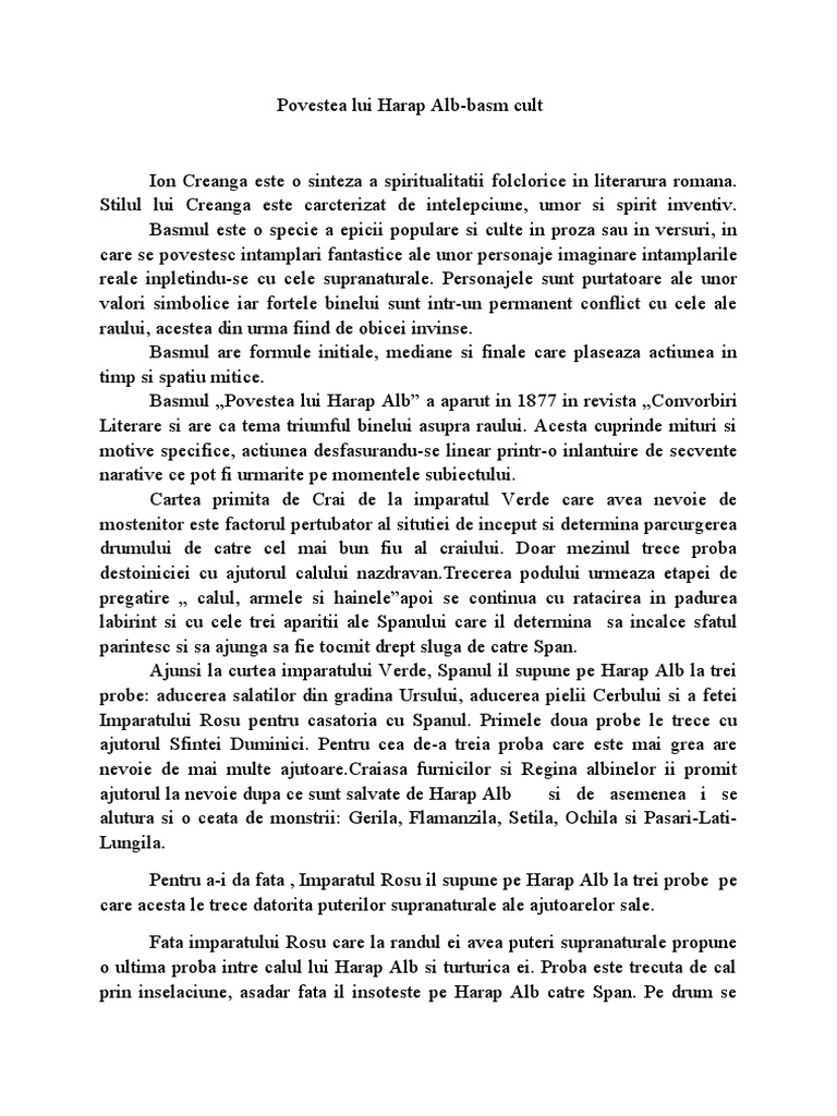 Povestea lui harap alb considerată sinteză a basmului românesc nicolae ciobanu se dezvoltă pe un tipar narativ tradiţional particularizat prin intervenţiile autorului cult care supune materialul epic unui proces de transformare în funcţie de propriile structuri mentale şi de propriile concepţii. Viziunea despre lume în opera povestea lui harap alb este pe de o parte clasică prin susținerea valorilor morale tradiționale precum bunătatea prietenia adevărul și prin lupta binelui împotriva răului. Multumesc 61 raporteaza abuz. Paloul hainele i calul nzdrvan.