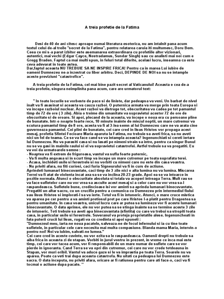 Apar noi dezvăluiri despre secretele de la fatima confirmate în trecut şi de papa benedict al xvi lea. Profetiile de la fatima cele trei secrete de la fatima reprezintă o serie de viziuni și profeții care ar fi avut loc ca urmare a apariției fecioarei maria în fața a trei tineri păstori portughezi lucia santos și verișorii ei jacinta și francisco marto începând cu data de 13 mai 1917. Profetiile de la fatima sfârşit al timpurilor omenirea este în pericol să dispară definitiv dacă nu şi schimbă cât mai repede comportamentul distructiv şi diabolic ce stârneşte mânia domnului. Scris pe o singură foaie de hârtie.