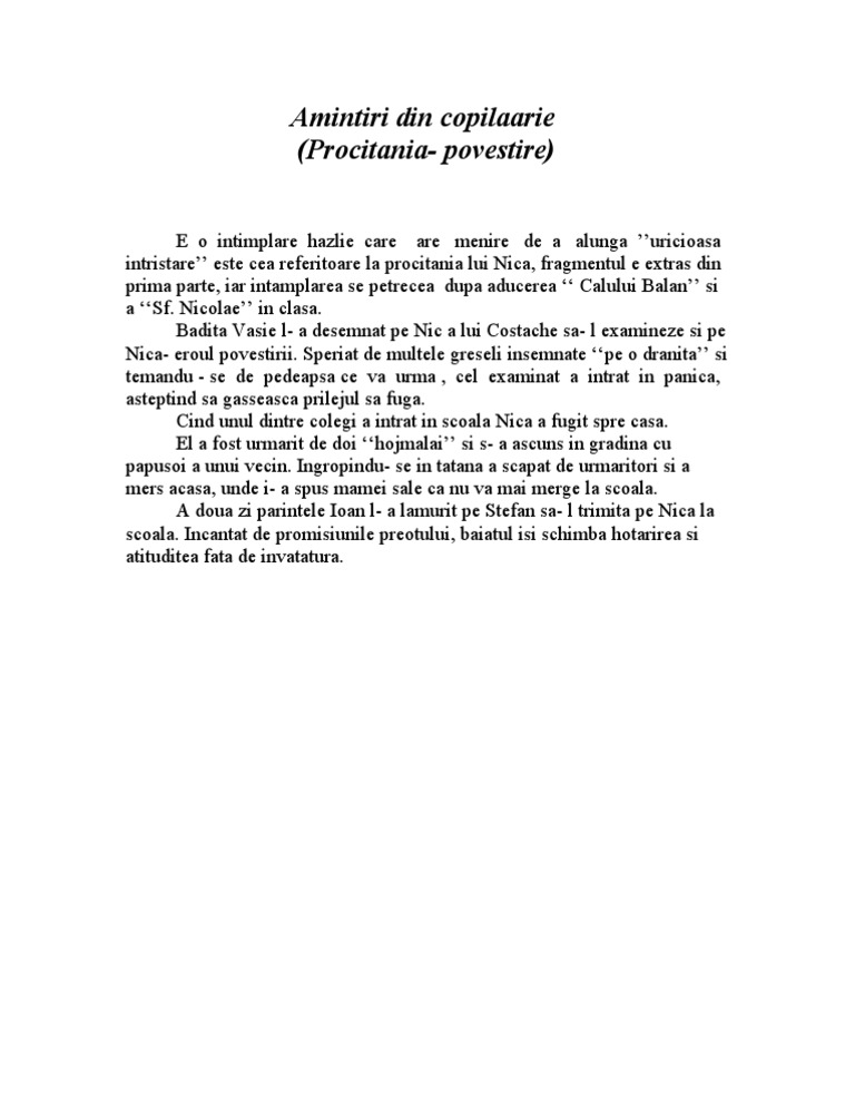 Amintiri din copilărie rezumat. Prima parte din povestea amintiri din copilărie incepe cu plecarea la scoala a lui nica si cuprinde si povestirea denumita caprele irinucai. Partea i în prima parte autorul ne povestește cum părinții se certau din cauza lui. Impreuna cu noi vei descoperi ca meseria de mamica este cea mai frumoasa ocupatie din lume.