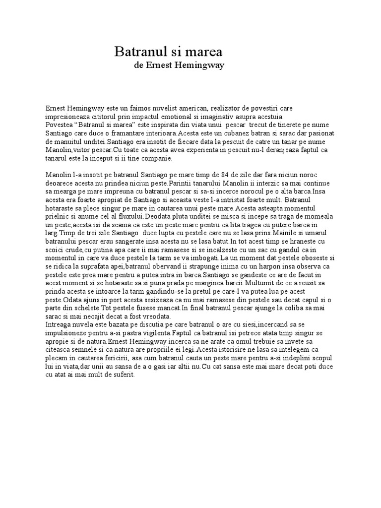 Vreau si eu rezumatul nuvelei batranul si marea de ernest hemingway va rog frumos. Rezumat scurt bătrânul și marea 3 santiago un bătrân sărac dintr un sat de pe coasta cubei se pregăteşte să plece din nou la pescuit după ce aproape trei luni de undiţa lui nu s a prins niciun peşte. Profesorii liceunet îți pun la dispoziție un rezumat structurat în asa fel încât să înțelegi cum se derulează evenimentele și să poți scrie alte materiale referitoare la acestă operă. Rezumat batranul si marea autorul ernest hemingway a primit premiul pulitzer pentru aceasta opera a sa fiind considerata ultima de mare importanta din viata autorului.