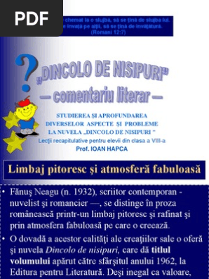 Dincolo de nisipuri de fanus neagu rezumat referate rezumate dincolo de nisipuri de fanus neagu rezumat intr o dupa amiaza din vara secetosului an 1946 un taran dintr un sat de campie buzoian pe nume susteru iese din casa manat de pofta unei tigari. Dincolo de nisipuri de fanus neagu rezumat. Opera dincolo de nisipuri urmareste un singur fir narativ cu un conflict unic contradictia dintre dorinta de viata a oamenilor si saracia provocata de lipsa apei accentul este pus pe construirea personajului prin fapte si atitudini pentru toate acestea dincolo de nisipuri de fanus neagu este o nuvela.