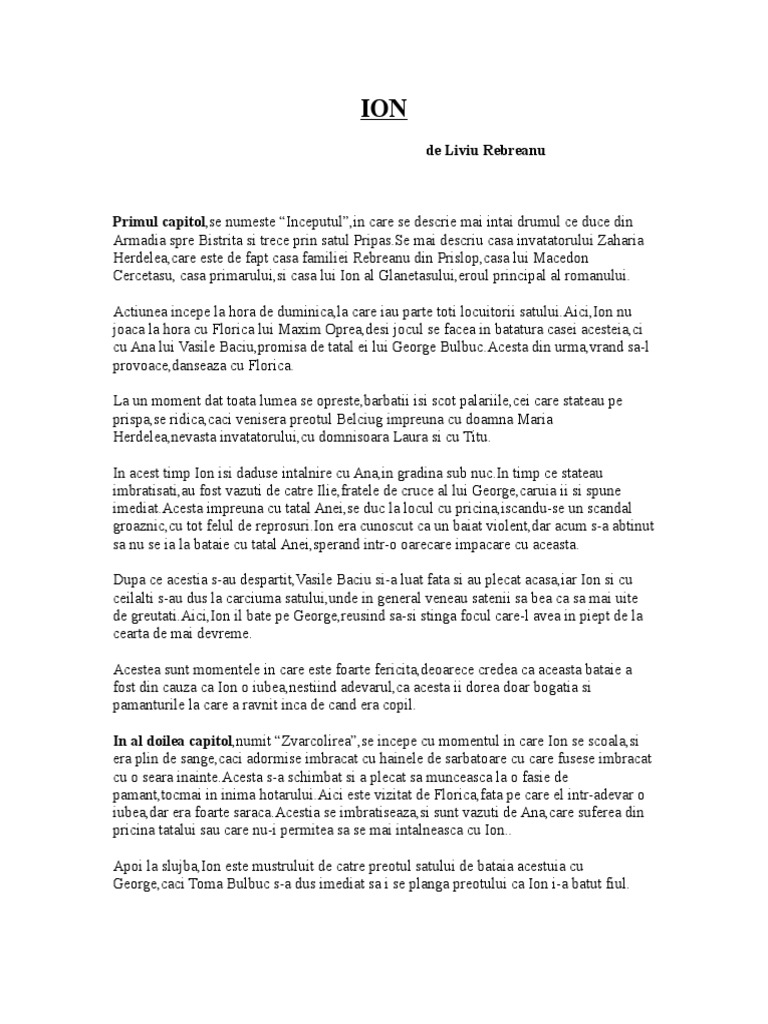 Save rezumat ion for later. Rezumatul romanului ion scris de liviu rebreanu unul dintre cele mai importante din literatura romana. Capitolul 1 inceputul naratorul descrie o zi de vara in satul pripas se aminteste de casa lui zaharia herdelea invatatorul din sat cat si de casa lui glanetasu. Save ion rezumat for later.