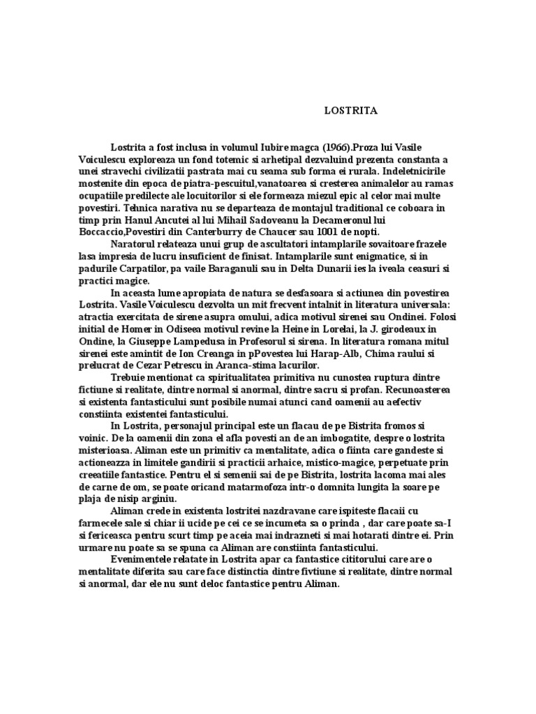 Lostriţa de vasile voiculescu comentariu literar rezumat literar crispedia ro construcţia subiectului incipitul povestirii îl constituie superstiţia populară eres că diavolul ia diverse înfăţişări pentru a atrage oamenii ca să i distrugă. Povestirea lostrița a fost scrisă de către vasile voiculescu și inclusă în volumul iubire magică publicat abia în anul 1970 după moartea autorului încadrându se astfel în proza contemporană fiind o povestire fantastică realul și imaginarul se îmbină armonios iar faptul că întreaga acțiune să subordonează legendei despre tânărul aliman pe care pescarii o spun. Moara cu noroc de ioan slavici rezumat literar enigma otiliei de george călinescu rezumat literar la ţigănci de mircea eliade rezumat literar sărmanul dionis de mihai eminescu rezumat literar patul lui procust de camil petrescu rezumat literar lostriţa de vasile voiculescu rezumat literar. Referate lostrita de vasile voiculescu referat surpriza a fost si mai mare cand au aparut povestirile mentioneaza e.