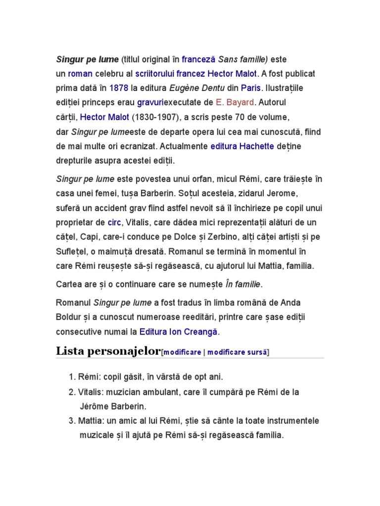 Rezumat singur pe lume. Singur pe lume titlul original în franceză sans famille este un roman celebru al scriitorului francez hector malot a fost publicat prima dată în 1878 la editura eugène dentu din paris ilustrațiile ediției princeps erau gravuri executate de e. în timp ce scriam această carte mă gândeam tot timpul la tine copila mea și numele tău îmi venea în fiecare clipă pe buze. Rezumat al cartii singur pe lume scrisă de scriitorul francez hector malot si publicata de acesta in anul 1878 la editura eugène dentu din paris. A scris mai multe romane dar este cunoscut mai ales pentru romanul singur pe lume a fost dedicat fiicei lui lucie.