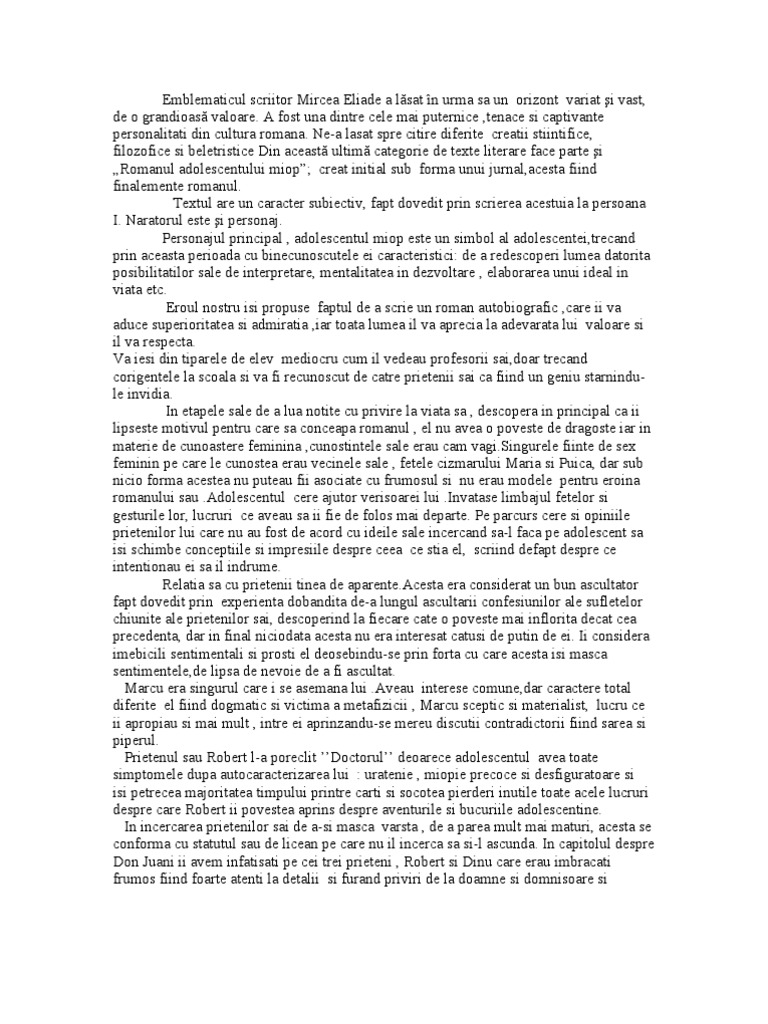 Rezumatul romanului adolescentului miop. Sigur multe au fost personalitatile care au avut din copilarie constiinta propriei valori si viziunea împlinirii lor sociale. Prefata mircea eliade este cea mai puternica mai tenace si mai captivanta energie autoconstructiva din cultura româna. Elevul de 15 ani dorea foarte mult sa scrie un roman a zis ca nu îi trebuie imaginatie doar trebuie sa povesteasca viata lui de adolescent cu crize si fericirea acestei vârste dar ca orice opera are nevoie de un titlu s a gândit sa l numeasca ragoste de copil sau flori de primavara sau la saptesprezece ani într un final i a ramas titlul romanul adolescentului miop dar nu stie cine sa fie eroul. îi povesteşte ce a mai făcut el şi că ar dori să meargă cu bibi la el.