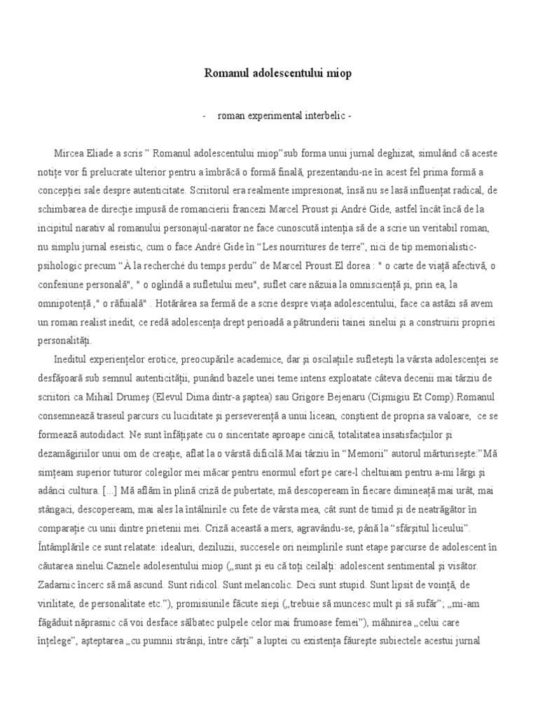 Pentru ca am ramas singur m am hotarat sa incep chiar azi romanul adolescentului miop. Trebuie sa scriu un roman prima scriere a reputatului istoric al religiilor este romanul adolescentului miop aparut din grija de a nu uita vremurile trecute. Romanul adolescentului miop este o operă scrisă de către mircea eliade sub forma unui jurnal în care acesta reproduce procesul scrierii romanului însuși. Profesorul de muzica publicase o romanta numita crinul si voia sa si recupereze banii pentru tipar cerandu le elevilor sa i cumpere brosura.