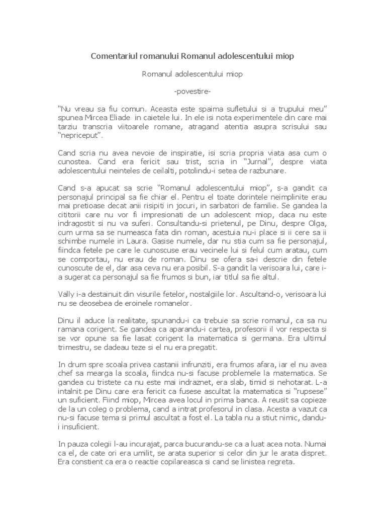Ca si el iubeam singuratatea si ma întelegeam numai cu prietenii inteligenti sau eruditi v. De mircea eliade rezumat n romanul autobibliografic romanul adolescentuilui miop mircea eliade ne povestete despre adolesena sa cu toate dilemele i slbiciunile specifice acestei vrste. Romanul unui adolescent miop. Continuarea afinitatilor în memorii ed cit voi.