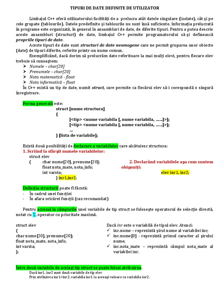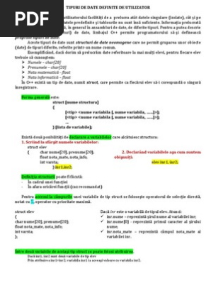 Sa se completeze pentru n n 100 elevi ai unei clase datele. De exemplu o persoană poate fi caracterizată prin câteva informații. Structurile de date pot fi definite în c folosind următoarea sintaxă. Structurile se deosebesc de tablouri prin următoarele aspecte.