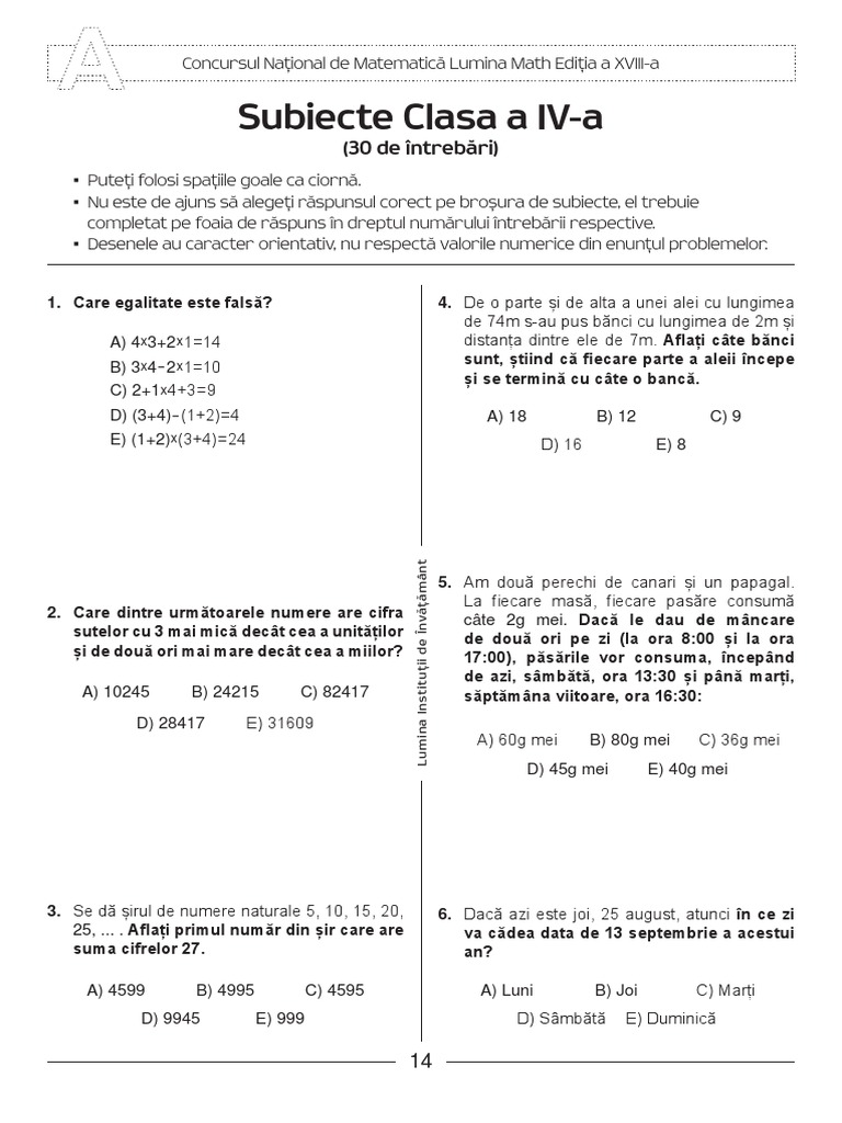 Din 30 de probleme grilă pentru clasele ii iv și 40 de probleme grilă pentru clasele v viii fiecare întrebare având 5 variante de răspuns. 8 im hpp p subiecte pentru clasa a iii a lumina math editia a xvii a 7. Nu este de ajuns s alegei rspunsul corect pe broura de subiecte el trebuie completat pe foaia de rspuns n dreptul numrului ntrebrii respective.