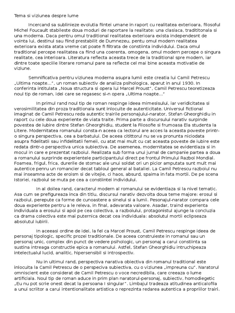 Ultima noapte de dragoste intaia noapte de razboi tema si viziunea despre lume ultima noapte de dragoste intaia noapte de razboi tema si viziunea despre lume roman modern subiectiv de analiza psihologica. In opinia mea romanul ultima noapte de dragoste intaia noapte de razboi este un roman care corespunde tuturor cerintelor lui eugen lovinescu cu privire la modernism aducandu l pe stefan gheorghidiu in prim plan. Aşa cum se exprima poetic însuşi autorul ultima noapte de dragoste îi conturează prin tema şi viziunea despre lume oglindită un autoportret din seria sufletelor tari. Tema si viziunea despre lume intr un roman din perioada interbelica.