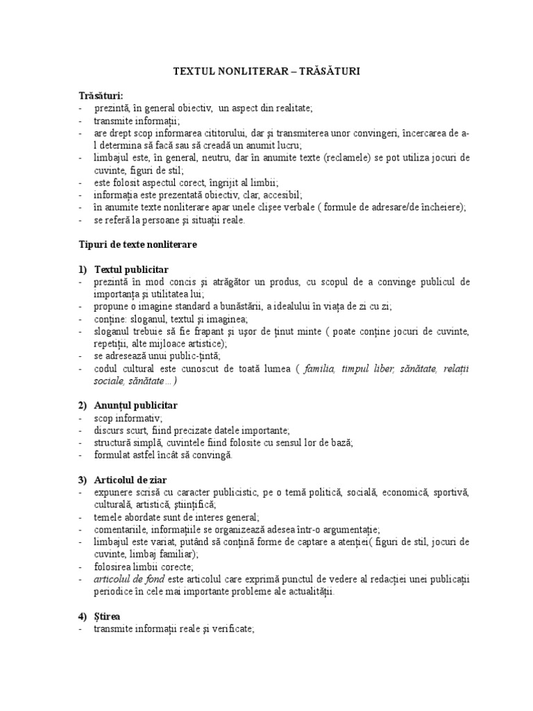 Materialul propune atât repere teoretice cât și exerciții de identificare a trăsăturilor diverselor texte nonliterare. Unele texte nonliterare pot avea caracter narativ în special cele din domeniul publicistic. Timpurile verbale folosite frecvent sunt. Tipuri de texte 08 iun.