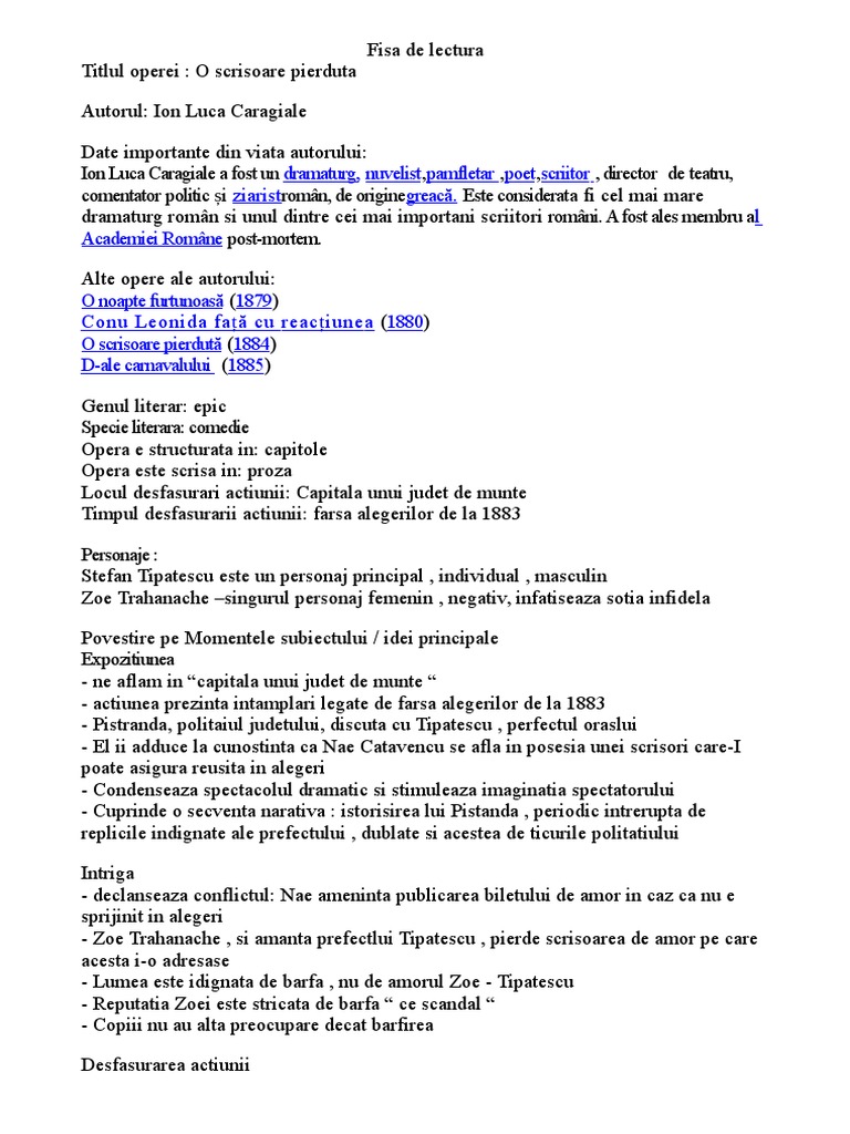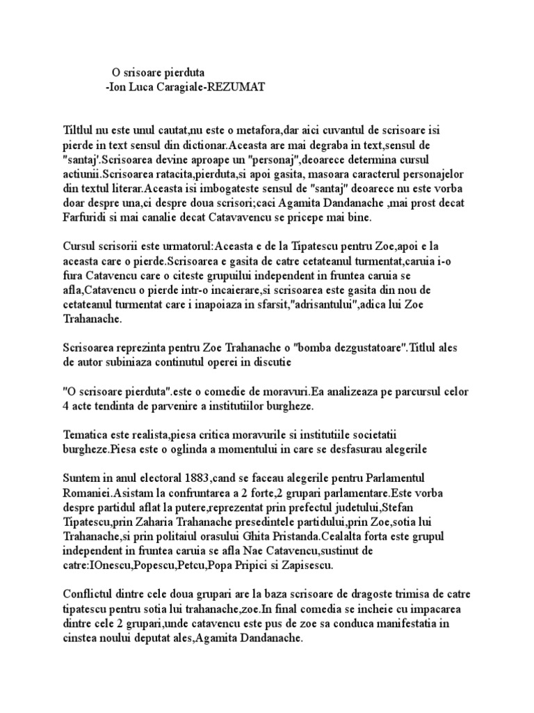 Titlul o scrisoare pierduta. Pompiliu constantinescu precizează în articolul comediile lui caragiale nouă clase tipologice dintre care următoarele sunt identificate și în o scrisoare pierdută. Opera literara o scrisoare pierduta se inspira din evenimentele politice ale anului 1883 este jucata pe scena in 1884 si publicata in 1885. O scrisoare care ar putea fi orice scrisoare și adjectivul pierdută. Piesa o scrisoare pierduta citita intial intr o sedinta a societatii junimea a avut premiera pe 13 nov 1884 pe scena teatrului national din bucuresti de atunci si pana astazi au avut loc nenumarate reprezentatii ale ei date fiind valoarea ei artistica desavarsita dar si remarcabila actualitate ce parca nega rastimpul de peste 100 de ani scursi intre.