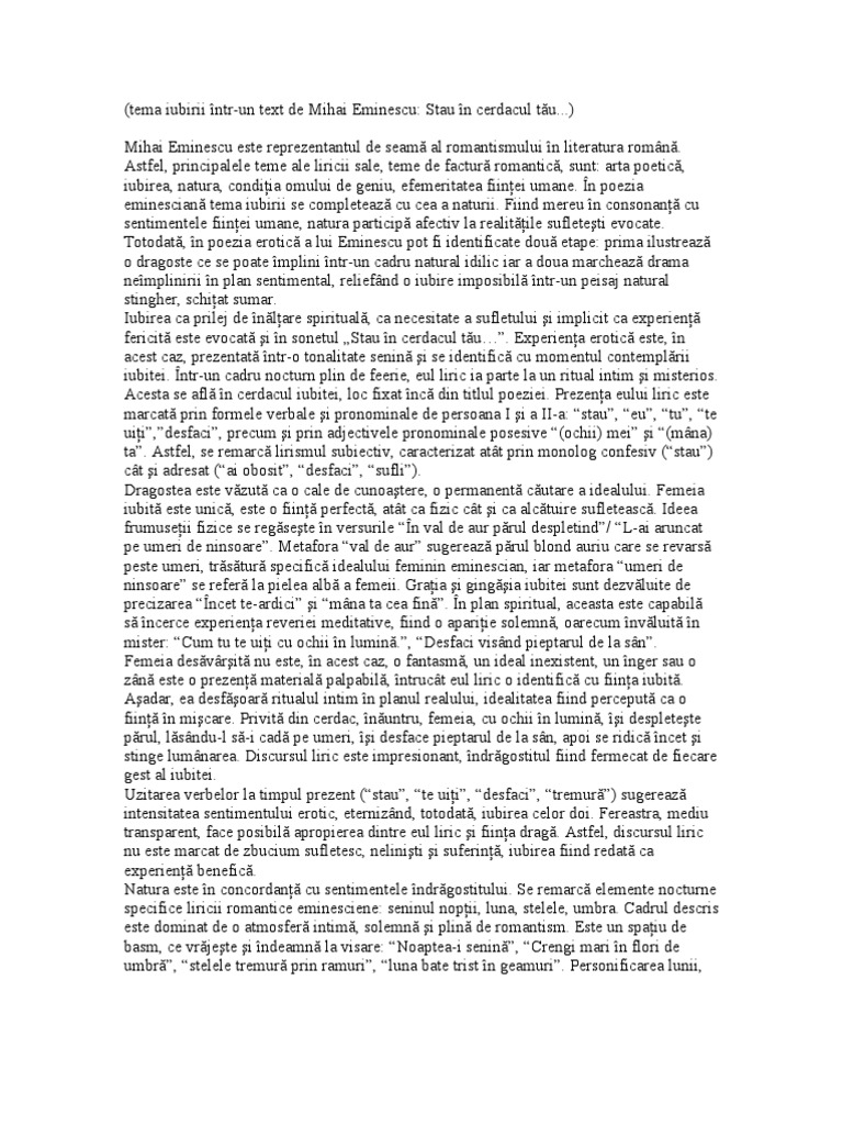 Motivul senzualităţii cunoaşte câteodată intensităţi surprinzătoare pentru cine cunoaşte tonurile obişnuite ale cântului eminescian de dragoste. în mare parte romantismul a fost o reacție împotriva revoluției industriale cât și împotriva normelor politice și sociale ale iluminismului. Conservând iniţial orientări şi atitudini paşoptiste specifice romantismului românesc de început romantismul eminescian se afirmă plenar în originalitatea sa abia după 1870. Romantismul eminescian se exprimă într un moment în care în europa se creează premisele afirmării unui nou curent literar simbolismul.