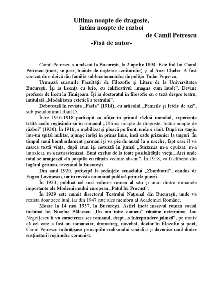 Adevarul 5 anul aparitiei volumului. Ultima noapte de dragoste întâia noapte de război camil petrescu. El pune capăt romanului tradiţional şi rămâne în literatura noastră în special ca iniţiator al romanului modern. 14 mai 1957 a fost un romancier dramaturg.