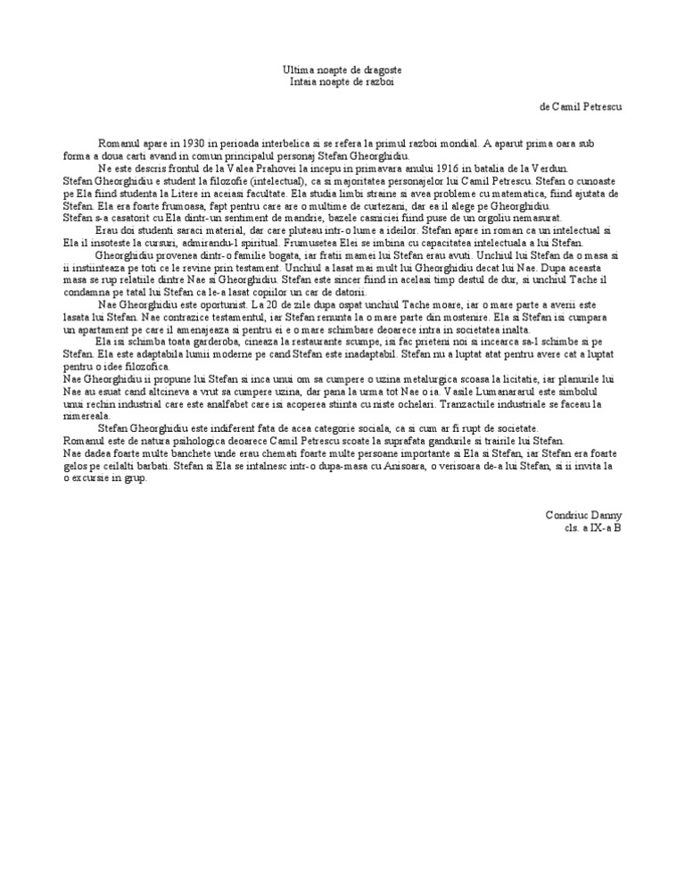 14 mai 1957 a fost romancier dramaturg doctor n filozofie nuvelist i poet. Un rezumat scurt de aproape o pagina si un rezumat pe capitole de 3 pagini la romanul de dragoste ultima noapte de dragoste întaia noapte de război. Ultima noapte de dragoste intaia noapte de razboi rezumat pe capitole. Tema si viziunea ultima noapte de dragoste intaia noapte de razboi de camil petrescu sub.