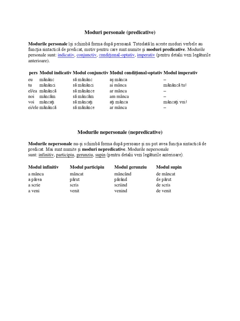 Modurile nepersonale nepredicative modurile nepersonale nu și schimbă forma după persoane și nu pot avea funcția sintactică de predicat mai sunt numite și moduri nepredicative modurile nepersonale sunt. Sunt auxiliare verbele a avea a fi a vrea. 1 infinitiv arată numele acțiunii se recunoaşte după prepoziţia a conjugarea verbului este dată de forma de infinitiv este singurul mod nepersonal care are timpuri verbale. A avea a vrea a fi.