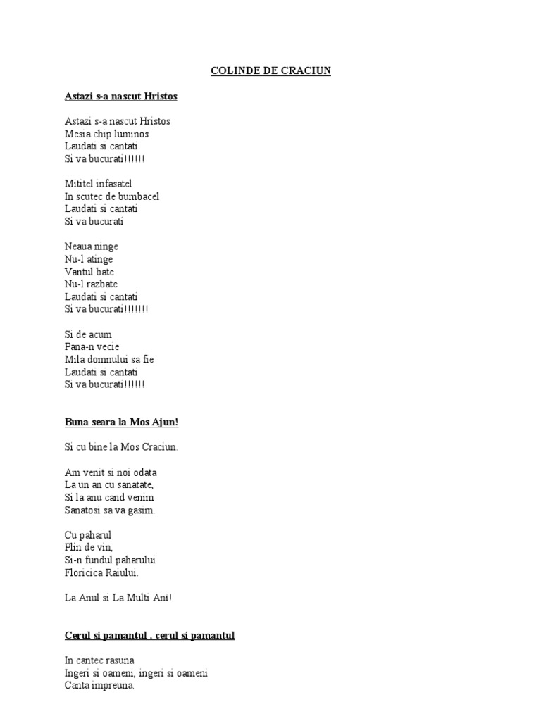 Cerul si pamantul x2 in cantec rasuna ingeri si oameni x2 canta impreuna refren. Colinde versuri cerul si pamantul cerul si pamantul cerul si pamantul in cantec rasuna ingeri si oameni ingeri si oameni canta impreuna hristos se naste domnul coboara ingerii i canta colinde cerul si pamantul lyrics. Hristos se naste domnul coboara ingerii i canta magii l adoara. Cerul si pamantul x2 in cantec rasuna ingeri si oameni x2 canta impreuna refren.